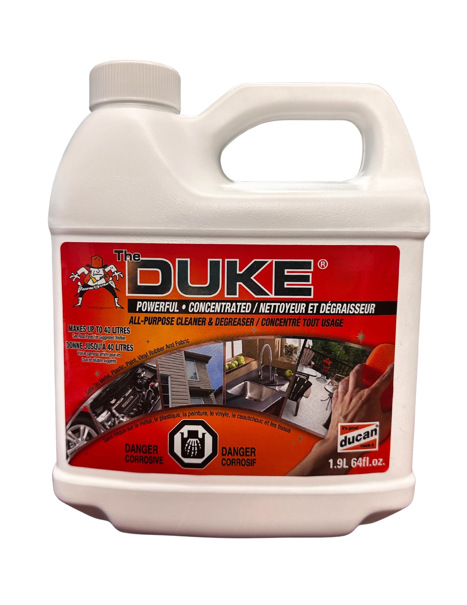 The Duke Cleaner and Degreaser is a powerful, economical cleaner for many surfaces such as decks, vinyl siding, driveways, walkways, sidewalks or stairs. It attacks bbq grease, oil and soot and grime. It can also be used indoors on surfaces such as chrome, tubs, sinks, tile and garage floors.