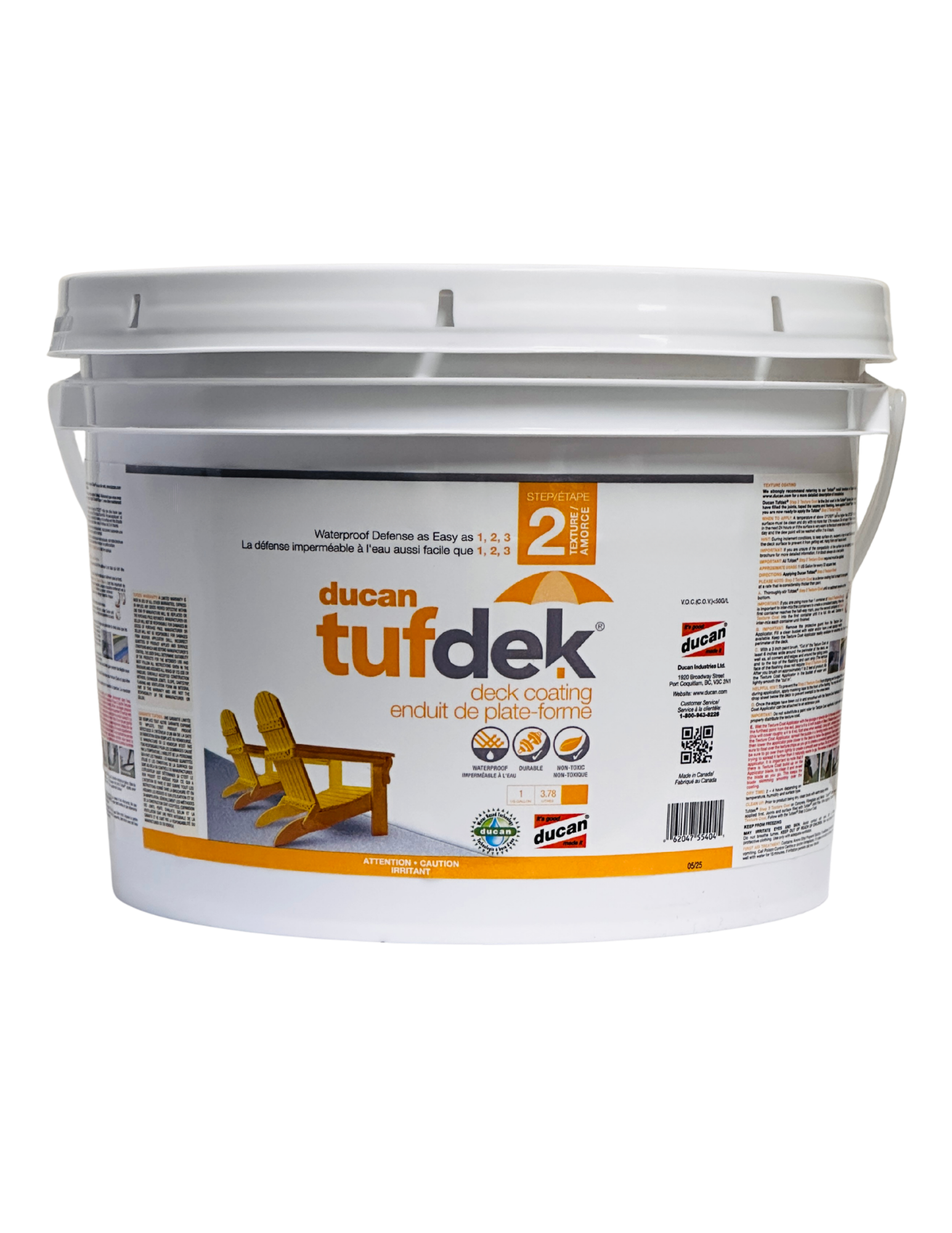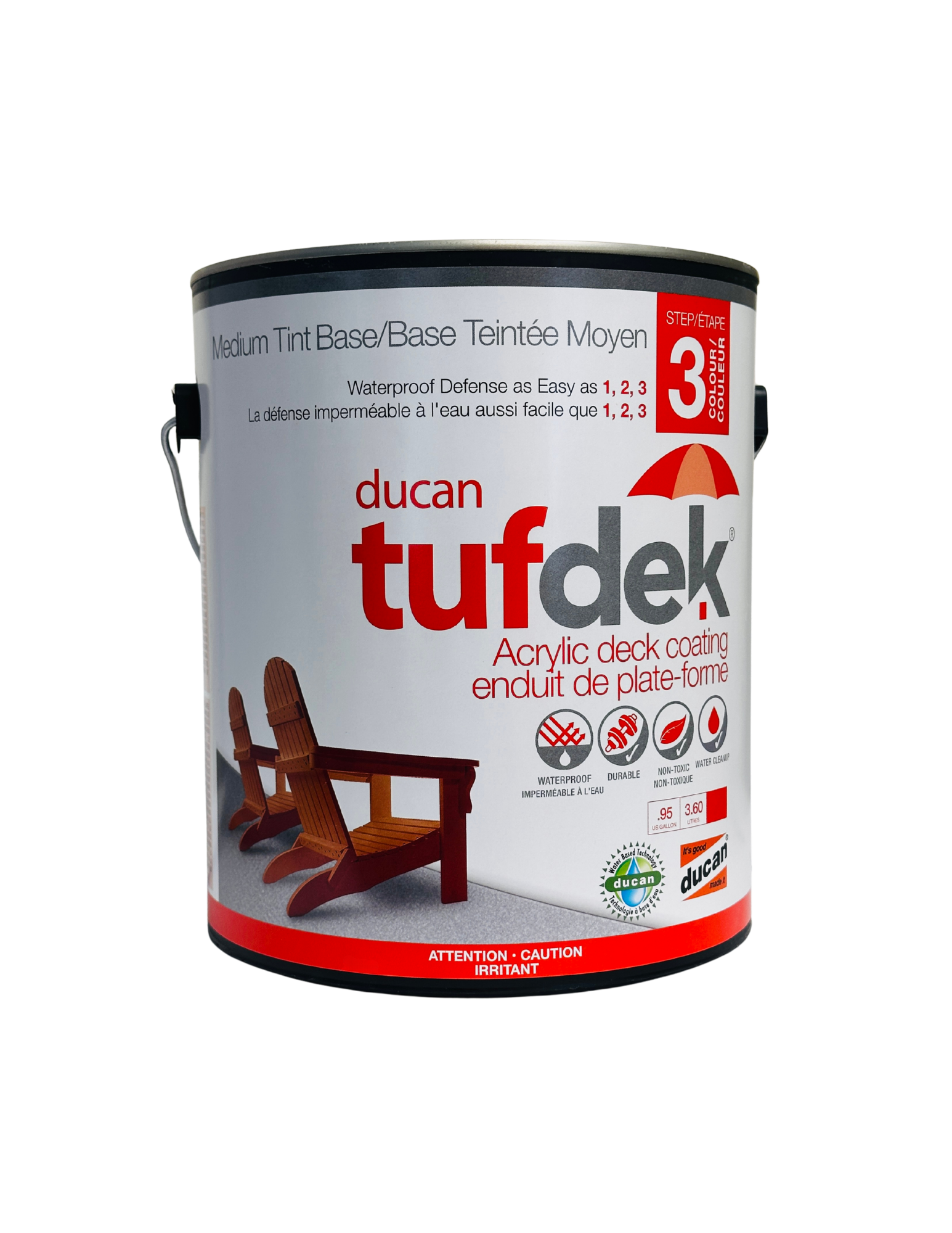 Tufdek® is a superior, non-toxic water-based coating system that provides long-lasting protection from water, sunlight and every day spills. The permanently flexible, protective and skid resistant coating system is scientifically formulated for all weather exposures and everyday use. Tufdek® provides superior performance over decks, docks, ramps, walkways, raised concrete decks and many other surface applications. In 3 easy steps, your exterior surfaces will be waterproof, UV-protected, and slip-resistant. Not only does Tufdek® offer durable protection for your deck surface, it also offers design flexibility. The Step 3 Colour Coat is tintable to 12 attractive colour options, leaving you with a beautiful deck that is sure to match any building exterior.